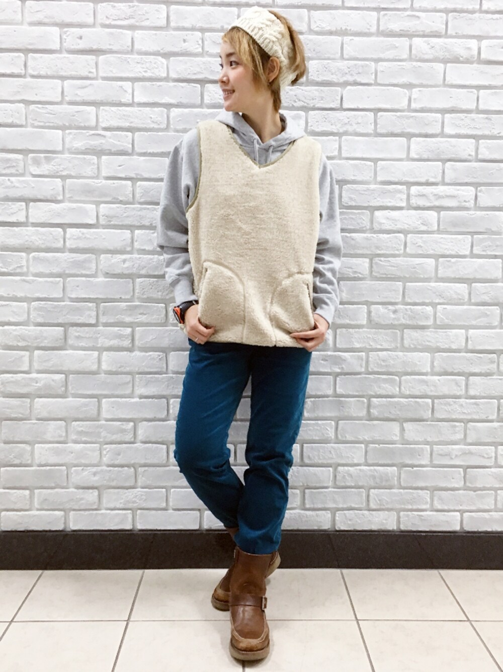 doco.のベスト「GREEN BOWL Boa V-neck Vest/グリーンボウルボアVネックベスト」を使ったコーディネート