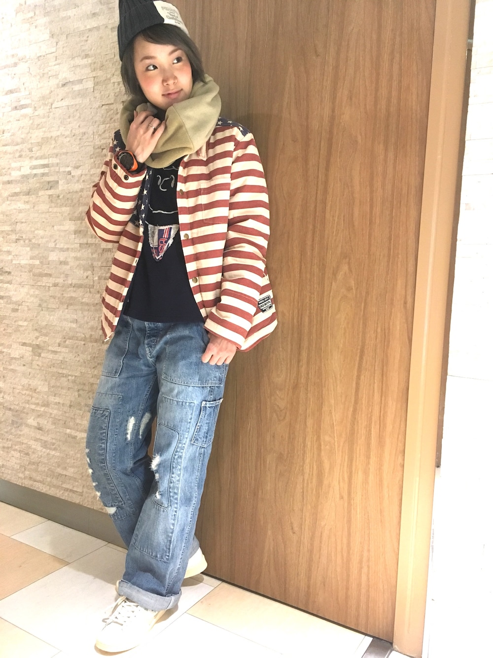 派手だけど、とてもかわいい!!オールドベティーズらしいアウターが入荷してきました☆ サイズはゆったりしており、中にトレーナーやパーカーも重ね着できます! デニムと合わせて、アメカジテイストに仕上げました☆ 中に着てるトレーナーの、チャーリーが首に巻いてるバンダナもアメリカ柄です☆