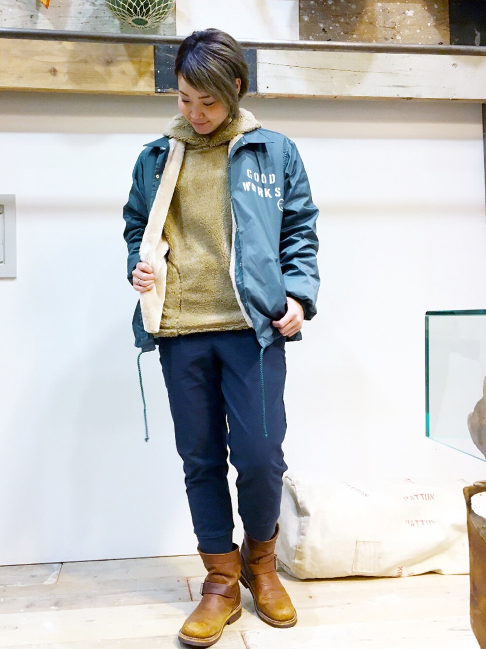 一段と寒くなってきたので、オススメあったかコーデのご紹介です☆ ボアパーカーに、裏ボアのコーチジャケットを羽織ると、 風も通さず、とっても暖かいです☆ ナイロンとボアなので軽くて肩も凝りませんよ〜〜 お気に入りの組み合わせです♪