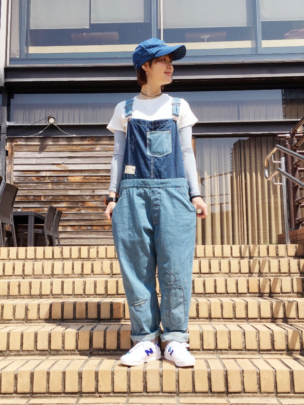 久々に着ました!オーバーオール☆ やはりオールドベティーズのオーバーオールは、デニムの生地が薄手でとても軽く、このざっくりした形がとても楽で大好きです☆ 2トーンになってるところも、個性的ですよね☆ これから暑い時期でも、中にタンクトップやTシャツ1枚と合わせられるのでオススメですよ〜♪