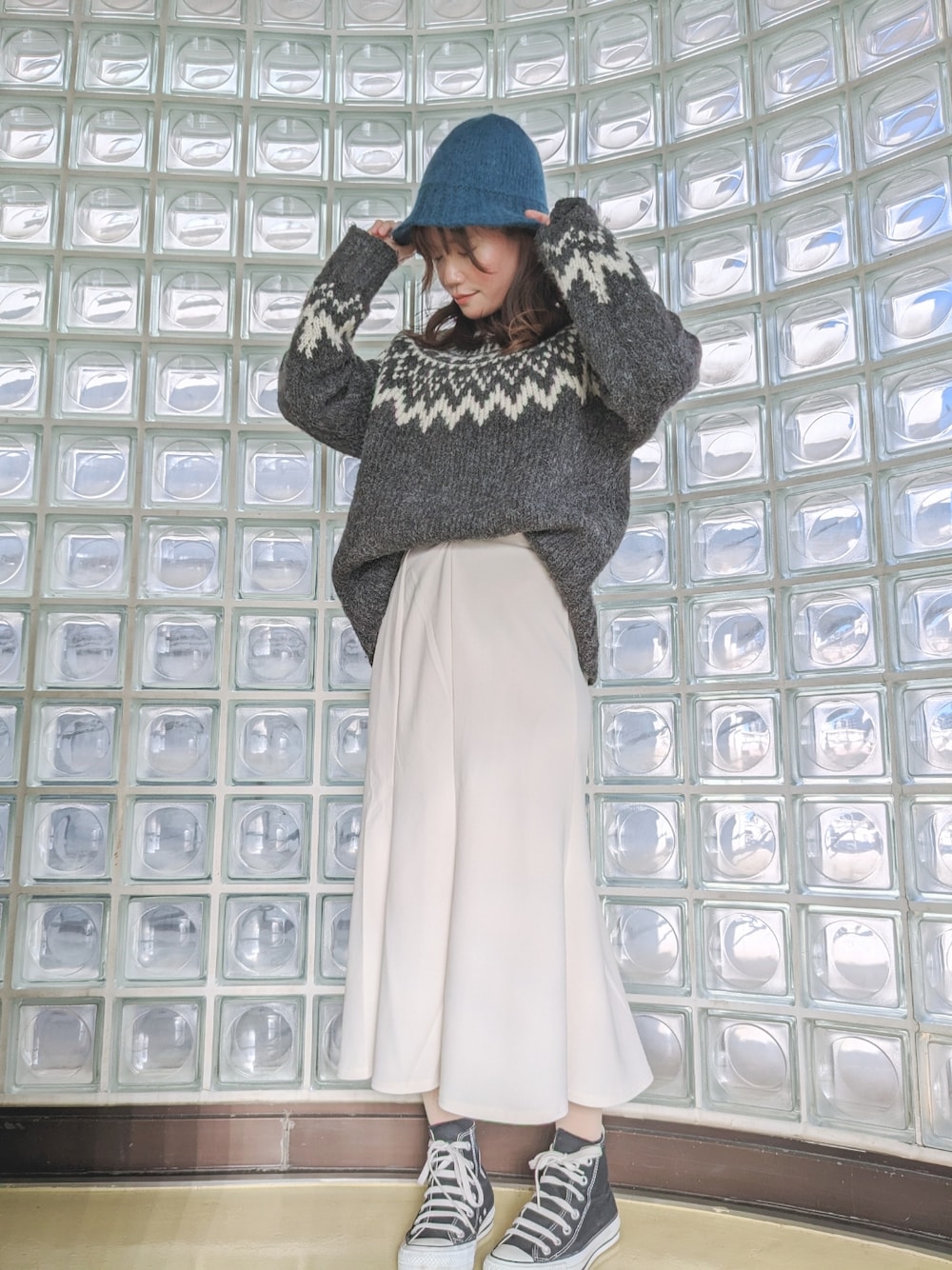 新年の初買いに原宿へ〜𓈒 𓂂𓏸 このコーデこの冬のお気に入り🫶🏻 UNIQLOのノルディックセーターのこの冬のスタメンで隙あらば着てる笑 マーメイドスカートはGU! Web限定の丈短め♩ ハイカットとかブーツとか合わせやすい丈感で低身長にもありがたい🙏 モノトーンには赤を差しがちだけど、今回は青にしてみた💙 クールな印象がめっちゃ今の気分( ˊᵕˋ* )♩