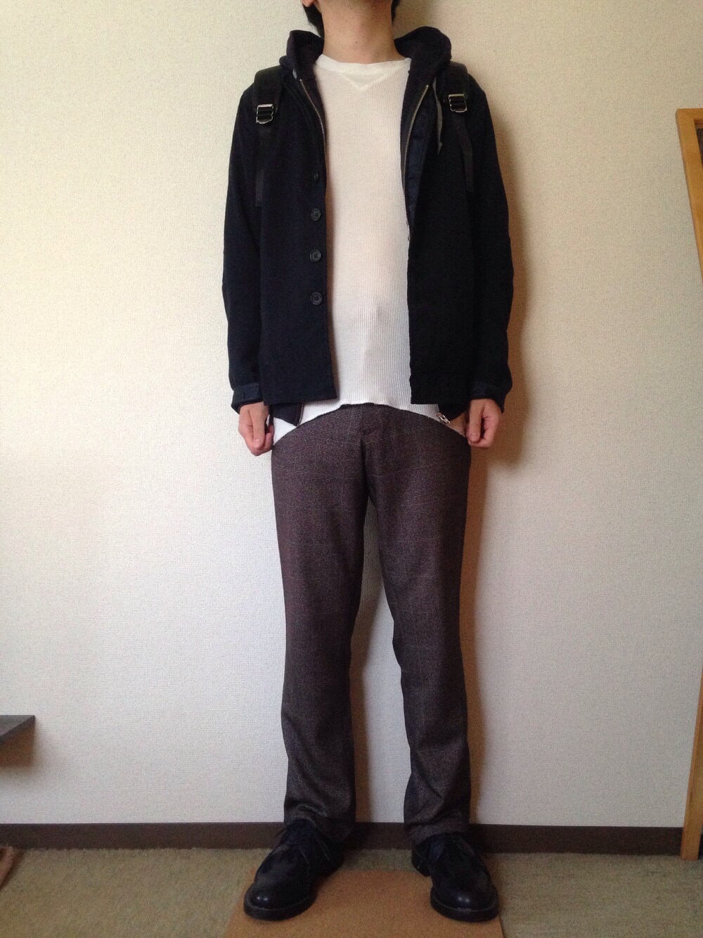 ジャケットとパーカーと短靴はネイビー。 パンツはグレー。 サーマルは白。 バックパックは黒。