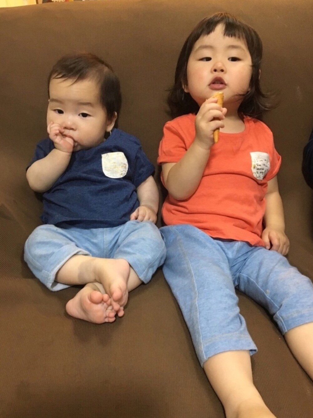 こんばんは🌝あかねくん&たっくんです 保育園から色違いで帰ってきたので📸 春頃ZARAのネットショッピングをパトロールしてたらなんか激安だったから色違いで買っちゃった♡気づいたらばいきんまんとドキンちゃんの色だね😈 細かいことを言うとポケットの柄の出方が違って少し残念だけど、みんなそこまで見ねえよっていう。 ママ仕事復帰して約1ヶ月。 毎日仕事忙しくて、楽しい♪ 楽しいけど「わたし子供0歳なんだけど、いつ体調悪くなって休むかわかんないんだけど、こんなに仕事割り振られて大丈夫?」と少し心配になる💦 けどわたしの理想の働き方「忙しくて定時上がり」ができているので、最高です✨ 時短なのでお先に失礼しまーすして、携帯開いて真っ先に保育園の連絡帳アプリ見るのが毎日の楽しみな時間です。 あかねくんは今日は公園に遊びに行って公園のベンチでお友達とどっちが肘置きに手を置くかで盛り上がったらしい😅 たっくんは手づかみでもりもり食べて口の周りをにんじんだらけにしていたみたい😋