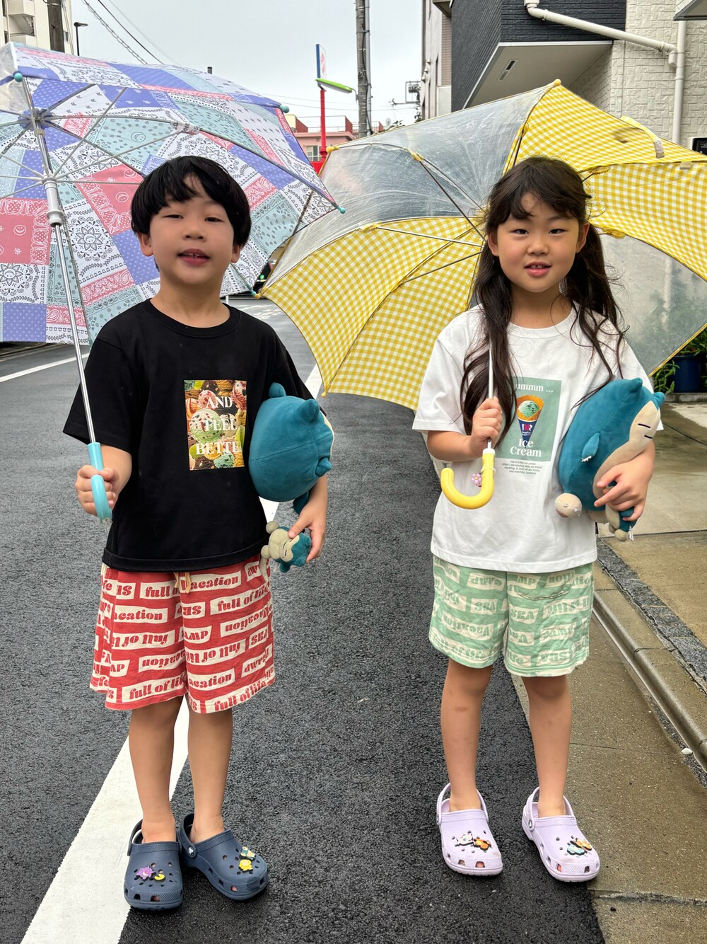 こんにちは☂️🍨あかねくん&たっくんです 雨ー!!台風けっきょくどうなった? サーティワンのアイスTとp.premierのパンツとクロックスで色違いコーデです