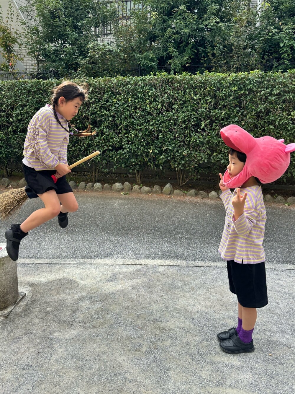 こんにちは🧙🦛あかねくん&たっくんです なんの仮装の用意もなかったので、箒にまたがって魔法使いと言い張る。たべっ子どうぶつのカバの頭は、たべっ子どうぶつランドに行ったときグッズ付きチケットを買ったらもらえました♪