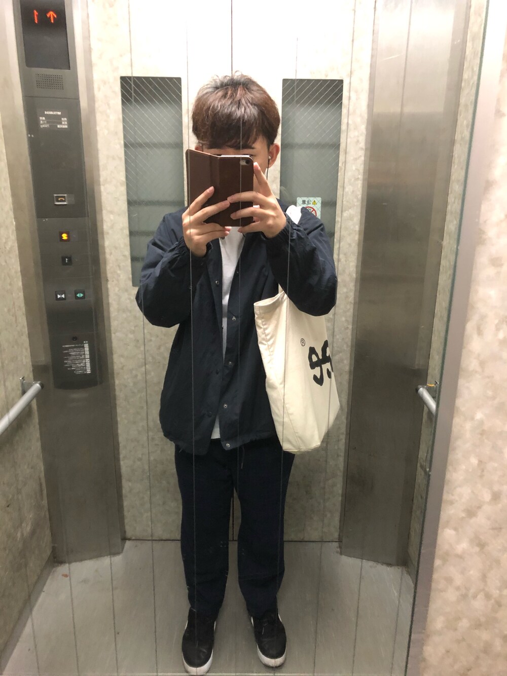 ネイビー×ネイビー 一応チェックパンツなんだけど遠くから見ると黒パンツにしか見えないねー あと見えないけどワインの長靴下履いてます🤑