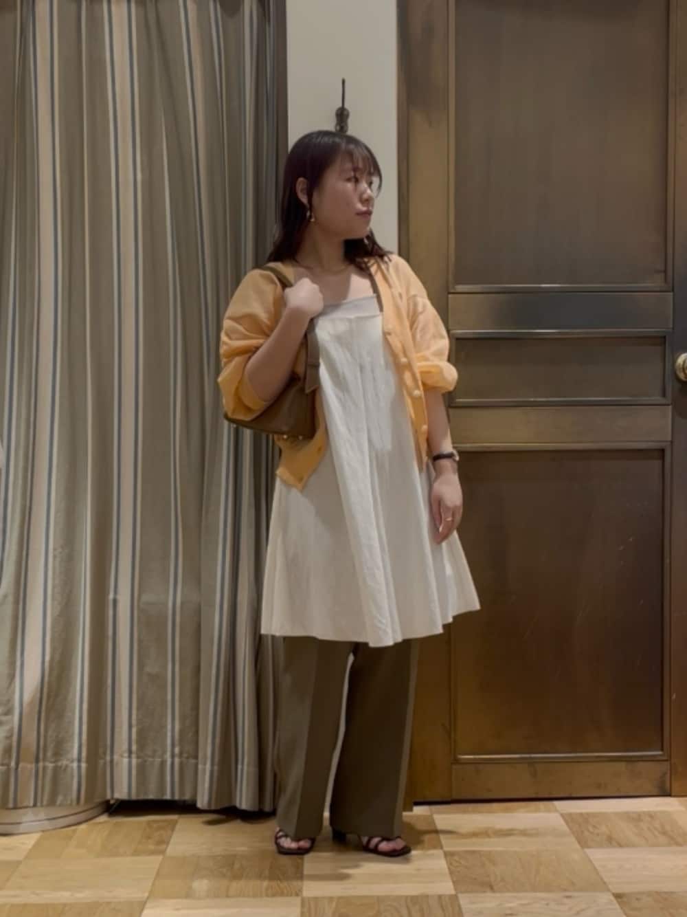 チュニック丈のキャミブラウスは短めカーデをレイヤードすることで低身長さんでも綺麗に着ていただけます!