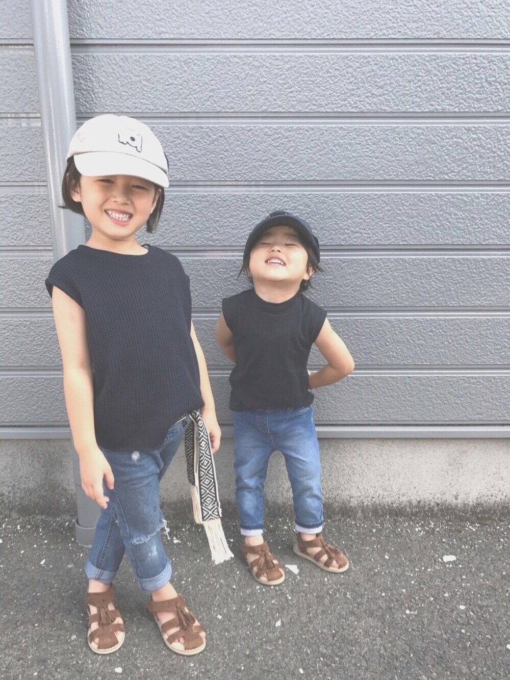 mee**naaのキャップ「キッズワッペンローキャップ」を使ったコーディネート