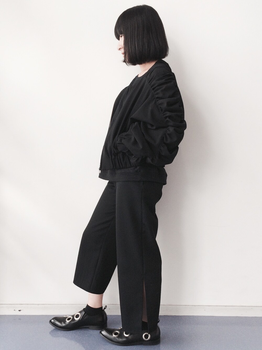 ALL BLACK 土曜日に作ったパンツ。 Natsumi Motoyama最新コレクション アシメスリットパンツ(笑) ブルゾンは安定のLIMIさん パンツと布が似てて セットアップ感◎