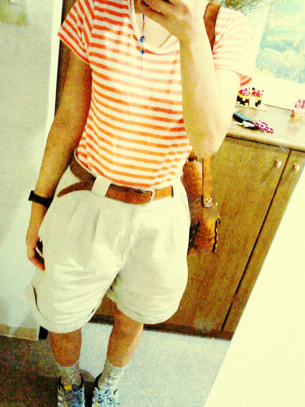 オレンジしましまTシャツ パールネックレス ヴィンテージぽしぇっとにベルト ボトムも古着 ヒョウ柄靴下にアディダス ヘアスタイルはポニーテール 焼き肉食べいった