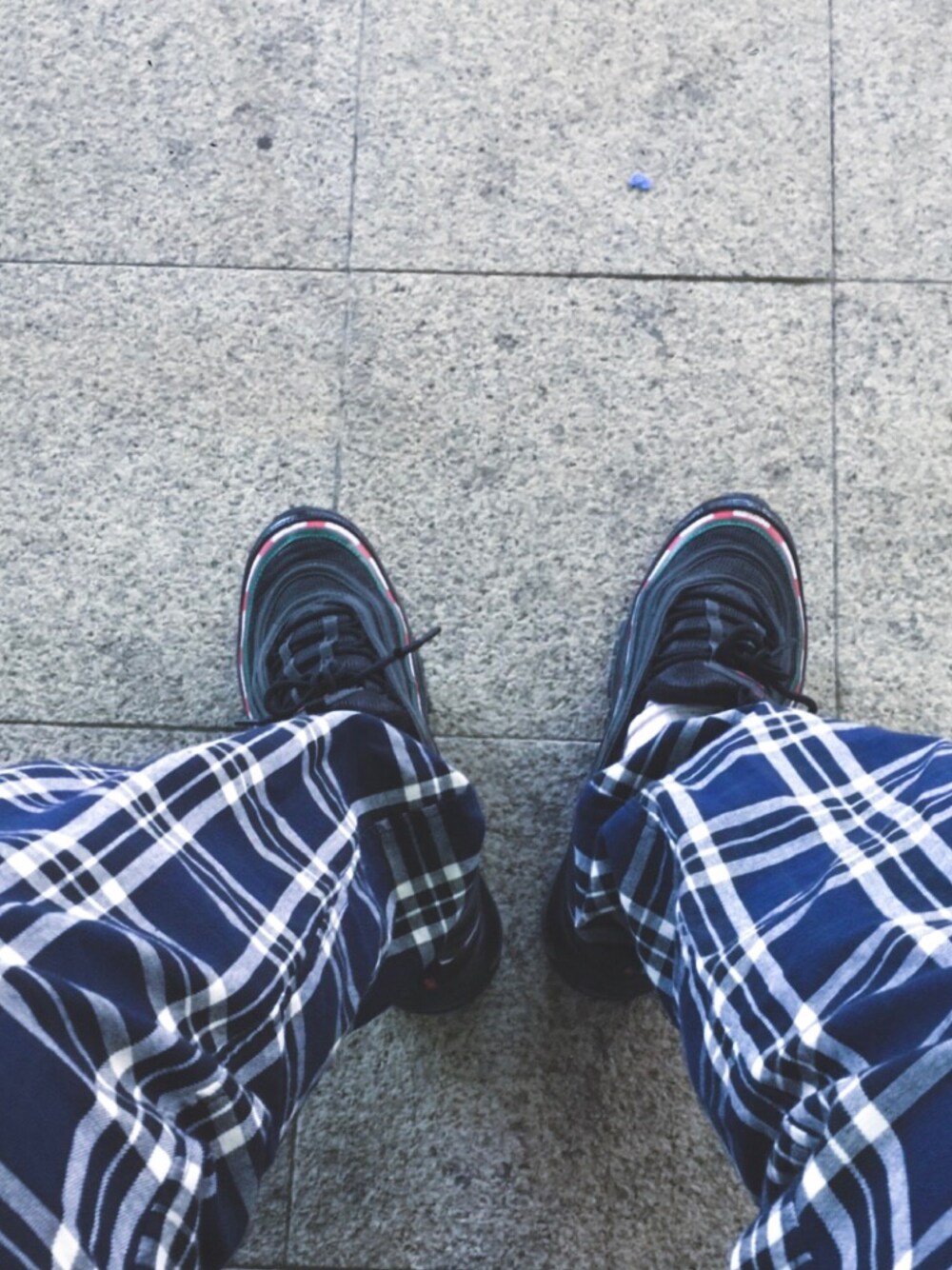 ブラック系のスニーカー、ブルー系のその他パンツを着用したメンズの春コーディネートの1枚目の写真
