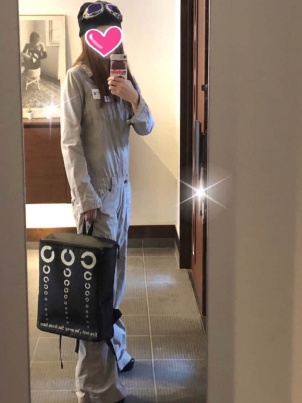 ゴーグルと視力検査リュックがポイントです♬視力検査リュックは今まで街で3人の男性とかぶりました🙃 グレーのツナギは、ズボンの裾がせまいので、生地を足してリメイク✨ストレート幅にしました😊