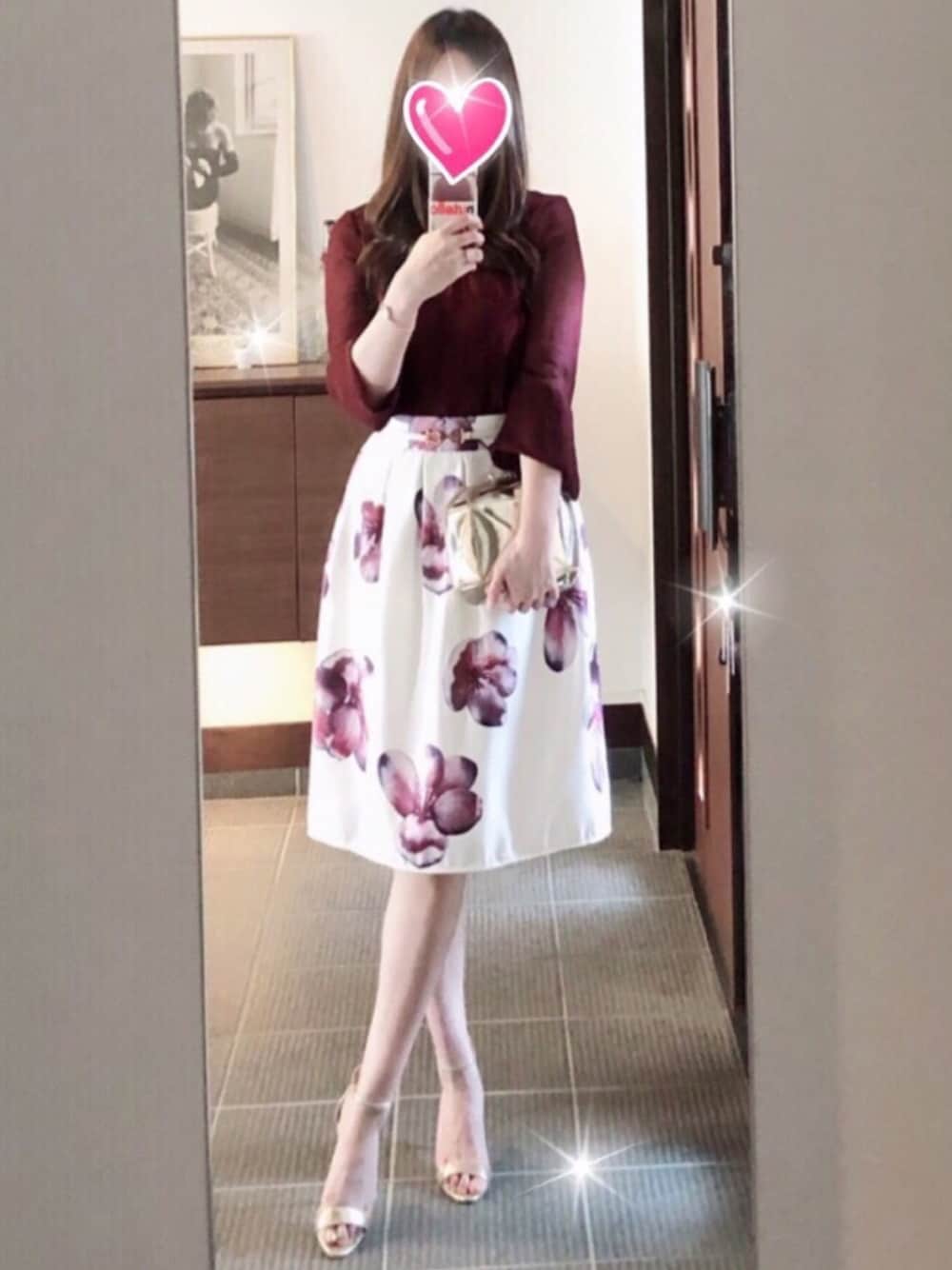 今日は、お花スカートがポイントです🙋 白地で涼しげに♬シンプルコーデ😊 ボルドー×ゴールドで女性らしい感じにしました🙆♀️✨