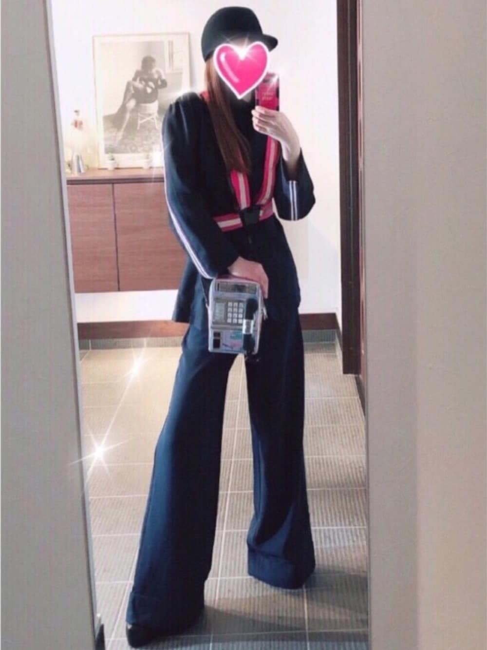 オール紺色コーデにピンクのガチ反射ハーネス装着🙆♀️ コム・デ・ギャルソンのジャケットは肩に黄色のライン、袖は紫のラインが入っています🙋♀️ 全体的シルエットになると、よくガンダムのドムに似てると言われます😂(小窓参照)