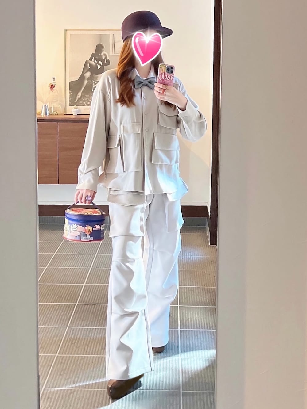naoさん主催のユニフォームフェス2022F/Wに参戦します♬naoさんよろしくお願いします🙋♀️ テーマ、工場のユニフォーム🏭←イメージコーデ(笑) 手に持っているのはマルハニチロ、さば水煮の缶詰めバッグです♬🐟🙆♀️