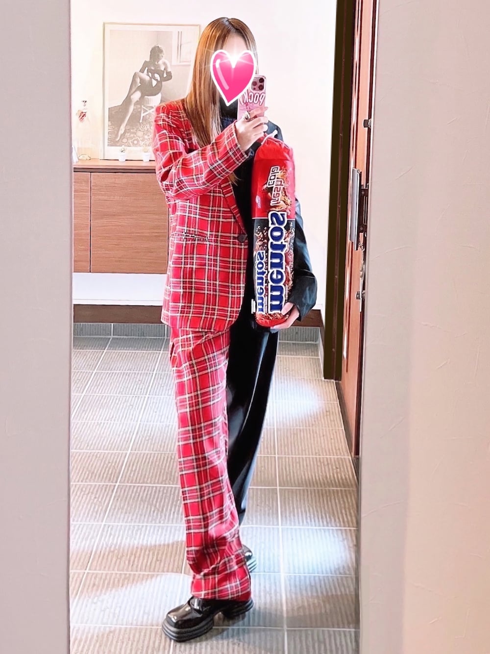 テーマ、メントス・フレッシュコーラ🙋♂️ 体半分タータンチェック柄のセットアップでカラーリンクしました🙆♂️