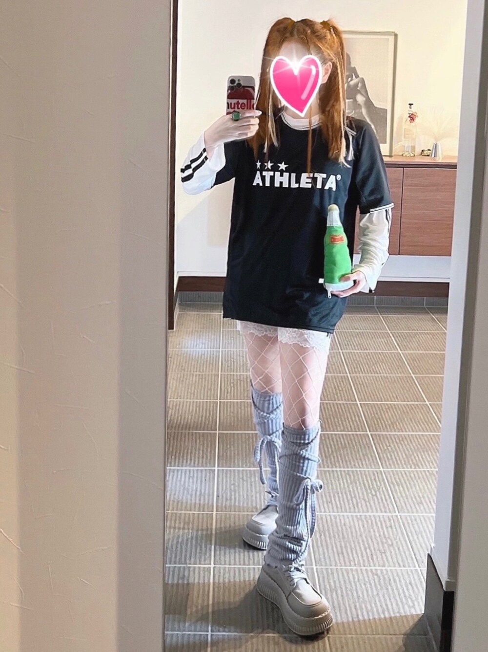 テーマ、ブロケットコア🙋♀️ サッカーウェア×ライン入りショートパンツにレースがついたアイテムを合わせました🙆♀️ 手に持っているのはチェリオのポーチです🤗