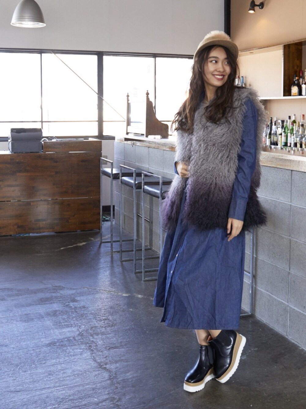 ☆ポンポンファーウールライディングハット ☆チベットラムファーベスト ☆ミリタリーシャツワンピース ☆サイドゴアプラットフォームブーツ シンプルなシャツワンピにチベットラムのファーベストとポンポン付きキャップで人と一歩差が付くコーデに😆💕