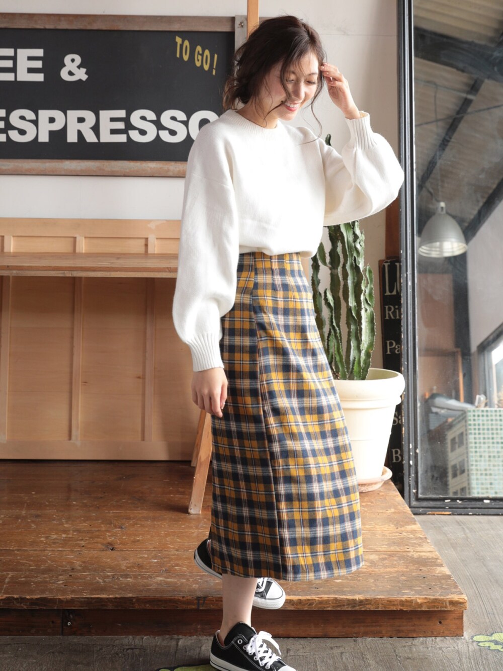 ⭐もちもちボリュームスリーブハイゲージニット ⭐ウール混タータンチェックタイトスカート もちもちニットは 名前の通り肌触りが最高🖤🖤 温かさと、肌触りは 大切ですよね😍❣️