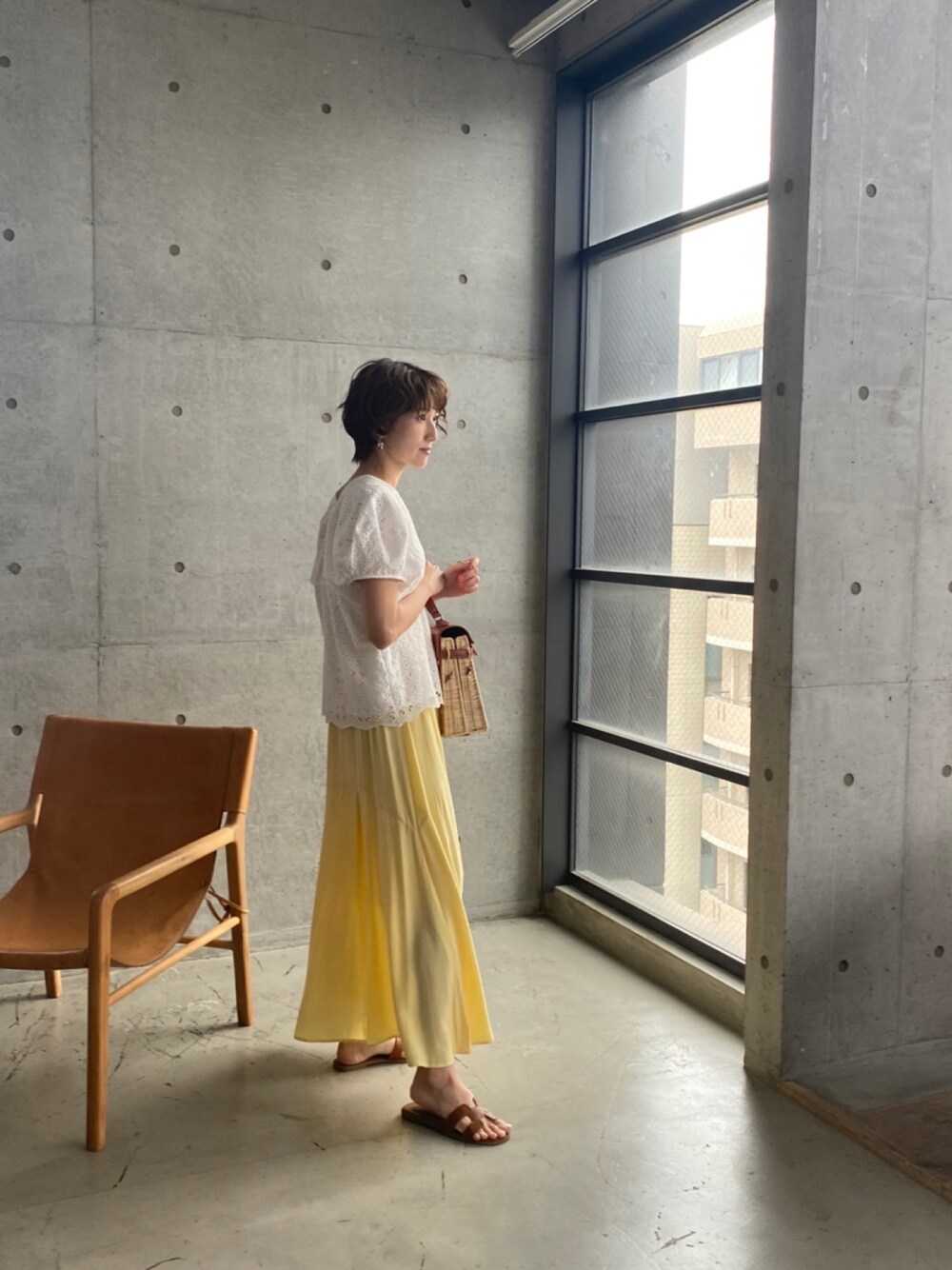 model:169cm/25cm オフィシャル限定HAPPY BAGの着回しコーデ♡ 新作のイエロースカートを主役に 小物はブラウンでまとめてみました。