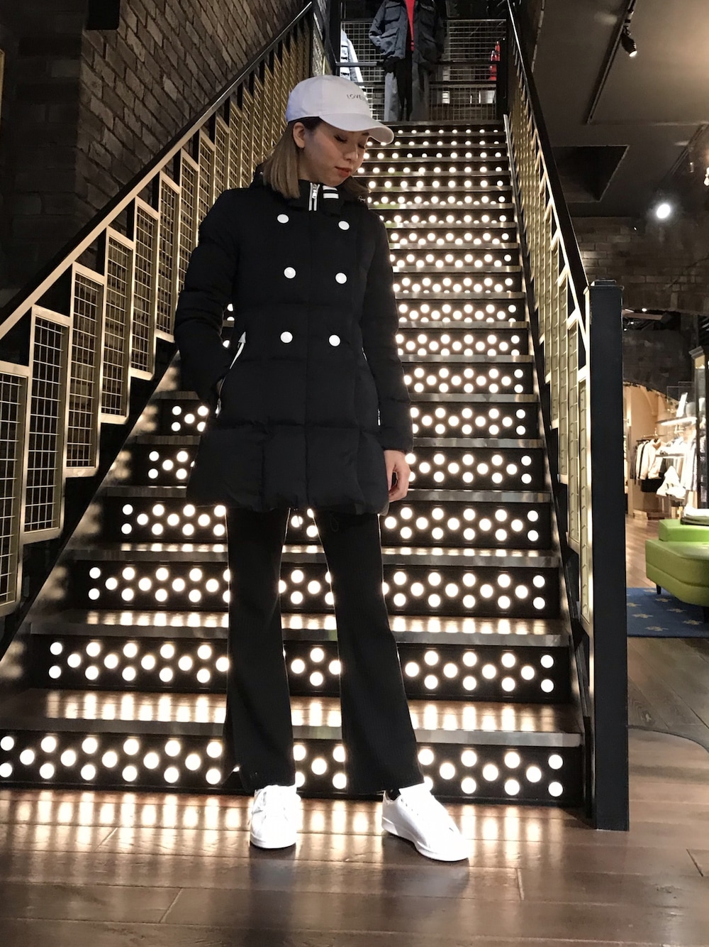 LOVELESSオリジナルの ミレーヌダウンにニットフレアパンツを 合わせたカジュアルなコーデ。 スニーカーとキャップで スポーティーな印象に。