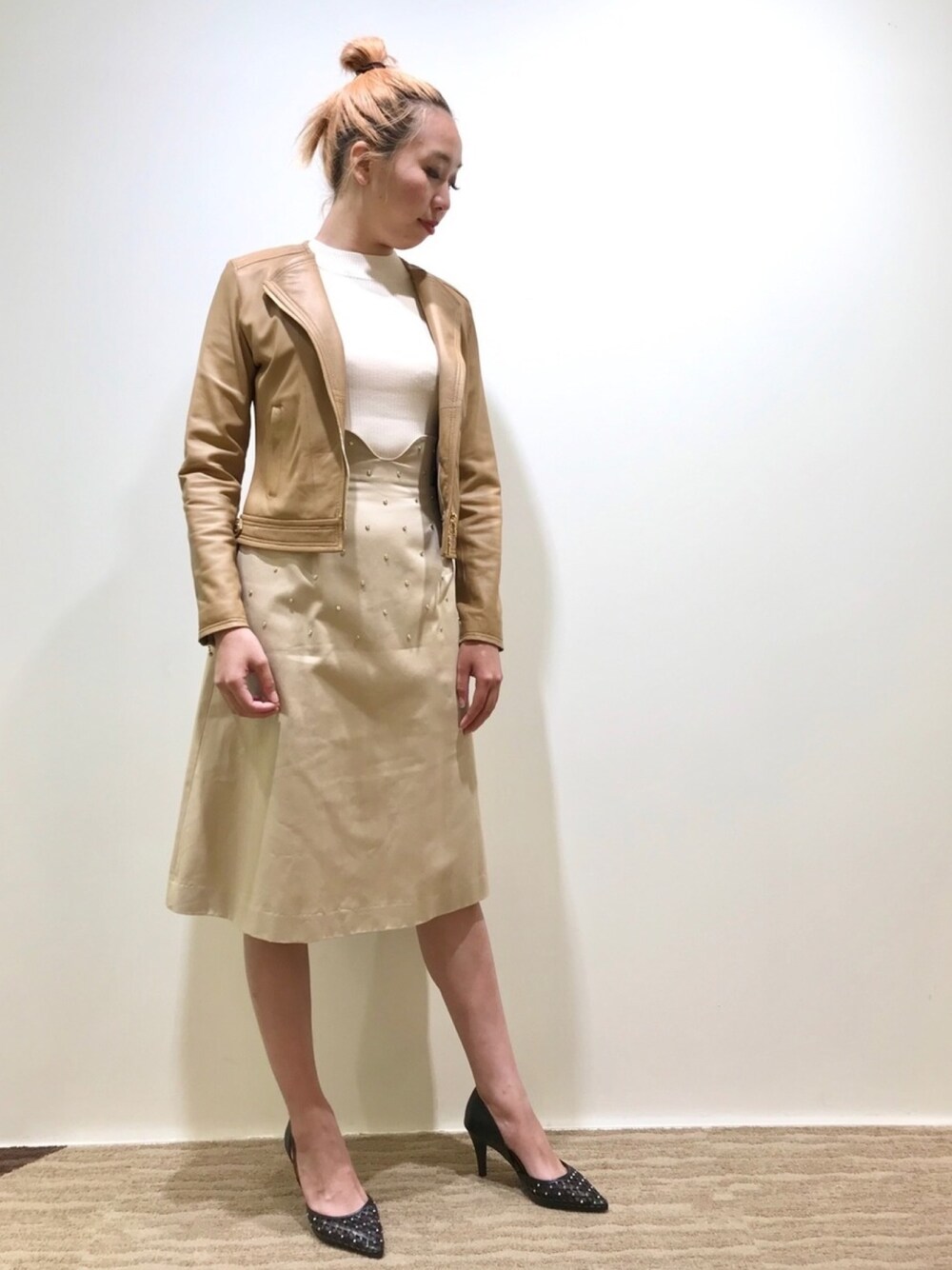 ワントーンベージュコーデ。 シンプルなのでスタッズが 散りばめられたデザインのスカートと パンプスでアクセントを。