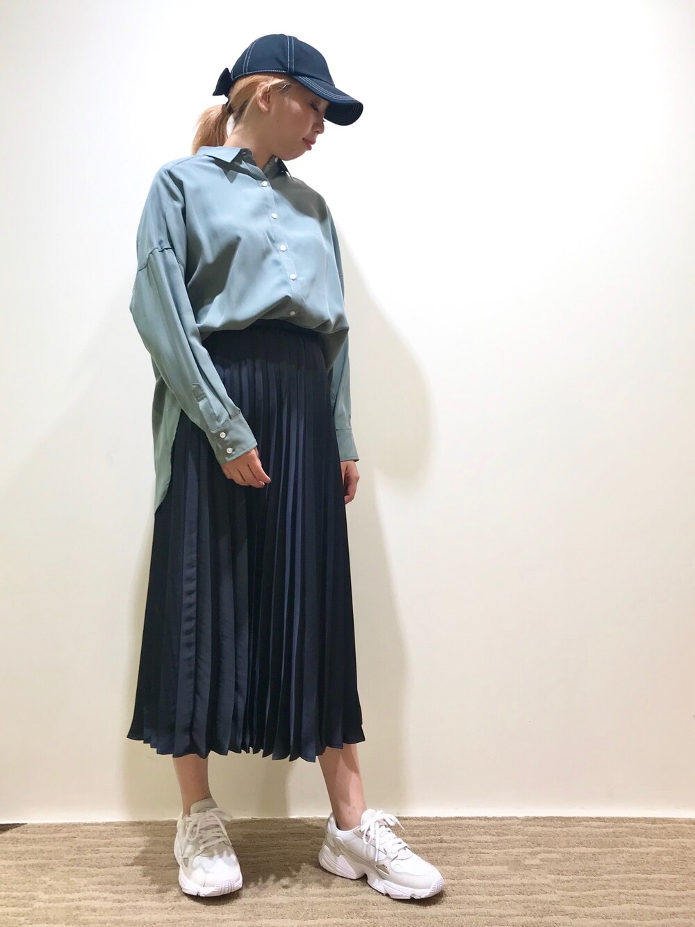 オーバーサイズのシャツに プリーツスカートを合わせて スニーカーとキャップで スポーティー要素を加えた ゆるっときれいめコーデ。