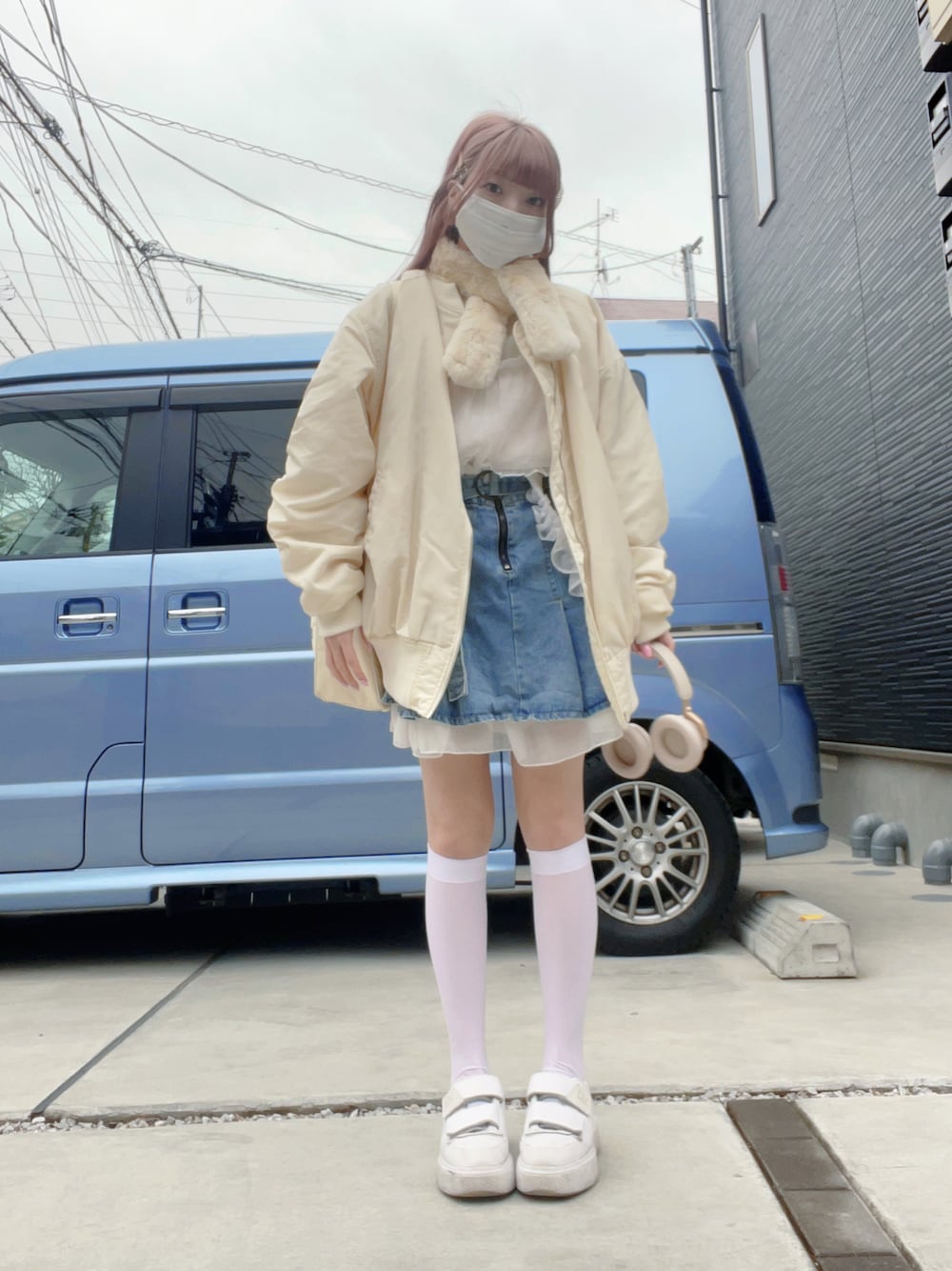 ワンピースにデニムスカートを重ね着しました☁️☁️☁️ 下から見えるレースが可愛い🦈