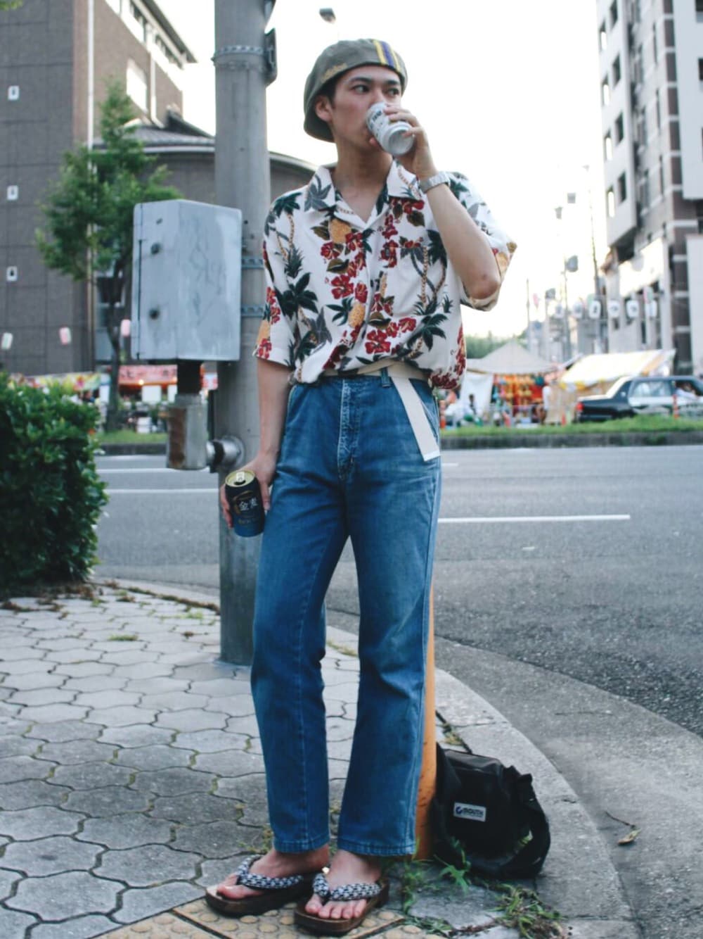 hunting cap / adidas80s aloha shirt / vintage70s denim pants / UFO70s 下駄 / no brand 祭りに行きましたビール最高 夏&汗