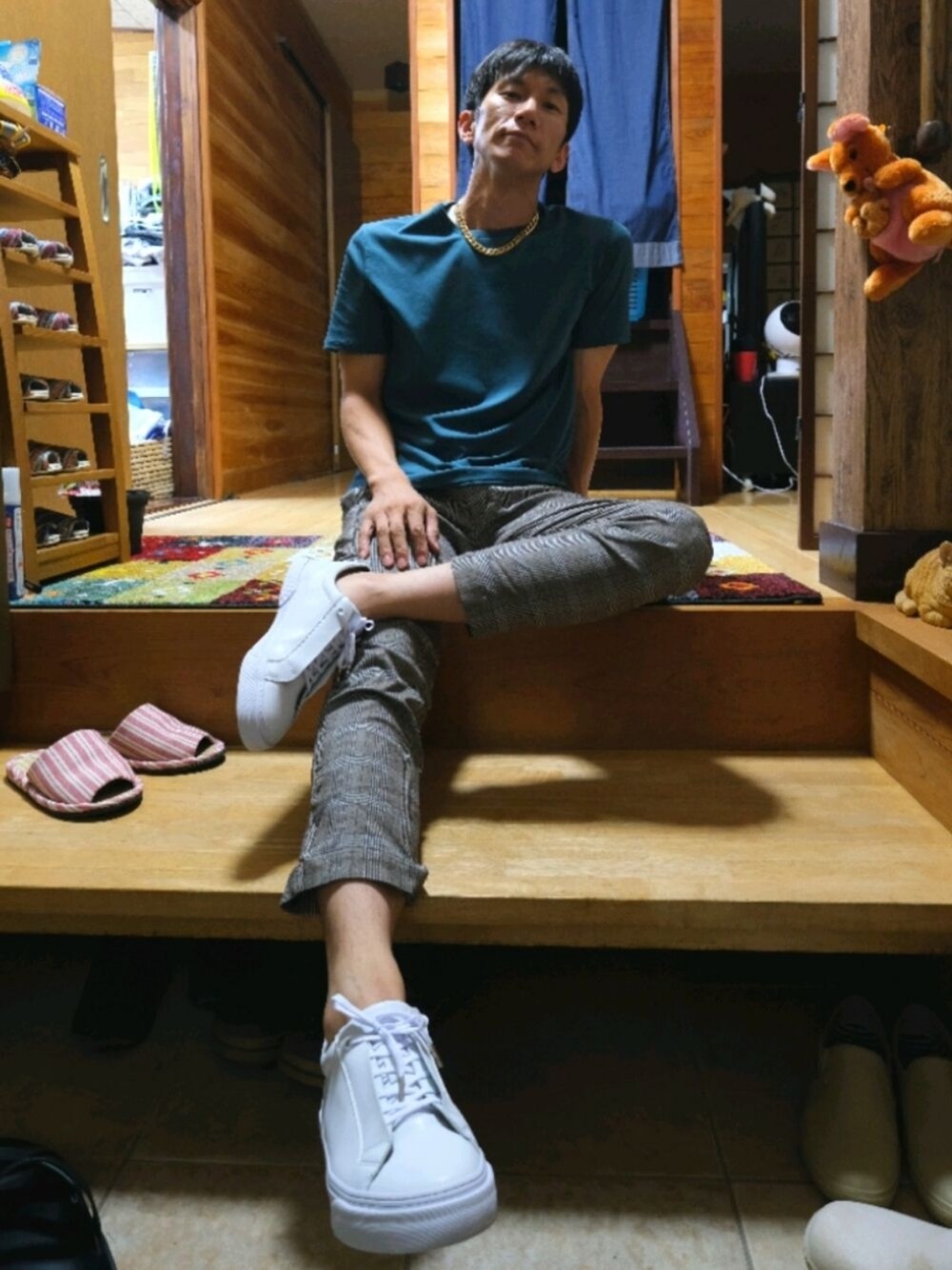 いつもご覧いただきありがとうございます! 今日は家の玄関からどうもです!タグカレンダーにあやかり、Taka'-Qセールで買ったばっかのグリーンのカットソー着てみました。もう少しものをどけてから撮ればよかったなぁ、スリッパとか。。。