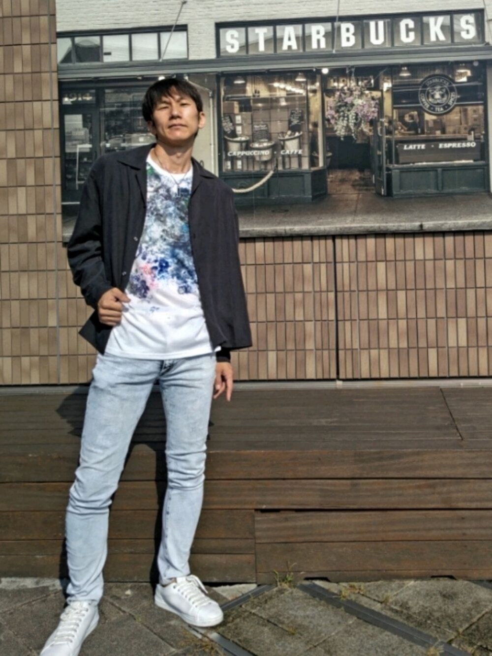 いつもご覧いただきありがとうございます! まだ昼間は暑いですが、朝は冷えますねー、、、おはようございます。今日はオープンカラーシャツの羽織コーデ。下のロンTがガラガラしてるので、子供っぽさを抑えるために、ボトムスから足先までワントーンっぽく揃えました、ただ、中身はオッサンです! 一緒に撮ったスタバのパネルの角度が曲がっちゃたったことが悔やまれますが、自撮りの焦りを感じますね。日曜だし、天気いいし、またコーデ撮影のストックに興じようかな♪