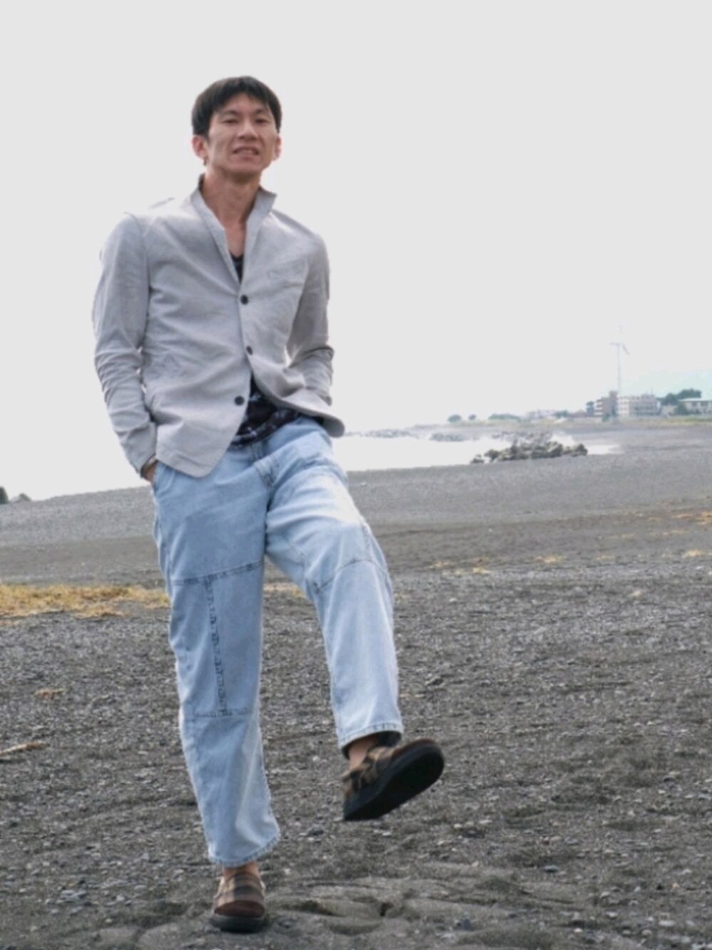 いつもご覧いただきありがとうございます! 秋色でコーデ続けてたので、秋色じゃない色での秋服の成立を試みましたっ。今回の主役はノーカラージャケット。秋色じゃないだけに、ノーカラーです!(オッサンのギャグは成立せず) NICOLEってよくショッピングモールにあるのですが、ZOZOには出店してないのですね。立体シワ加工カバーオールジャケットって名前だそうで、自然な感じでシワが加工されてるのが良き。色も明るくて冬物アイテムの中で印象がかなり変わって好きです♪ 撮影は海で誰もいなかったので快適な自撮りができました。表情は軽やかで、動きがあるように見えて、実はこの状態で静止して自撮り。本当は足ぷるぷるしてます(汗)