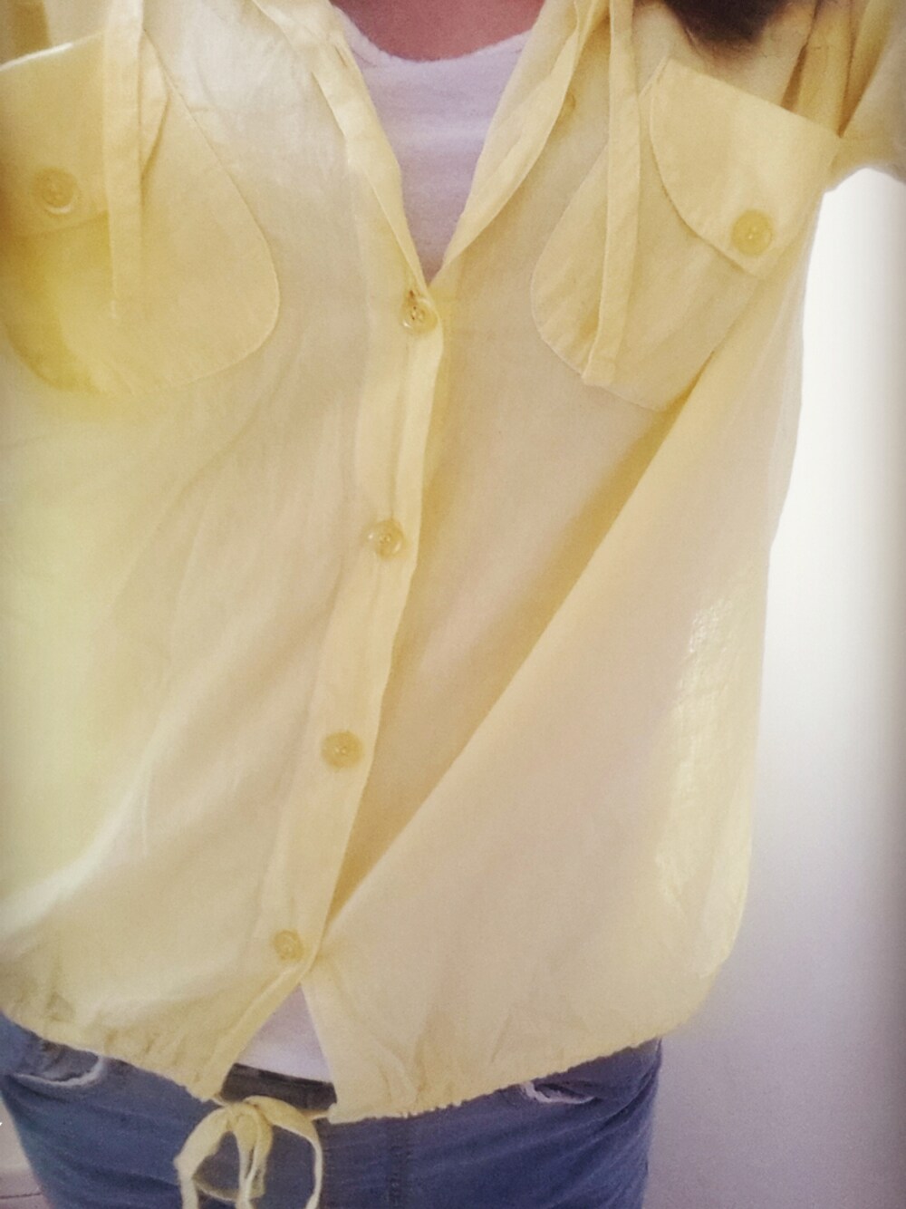 イエロー系のシャツ/ブラウスを着用したレディースの秋コーディネートの1枚目の写真