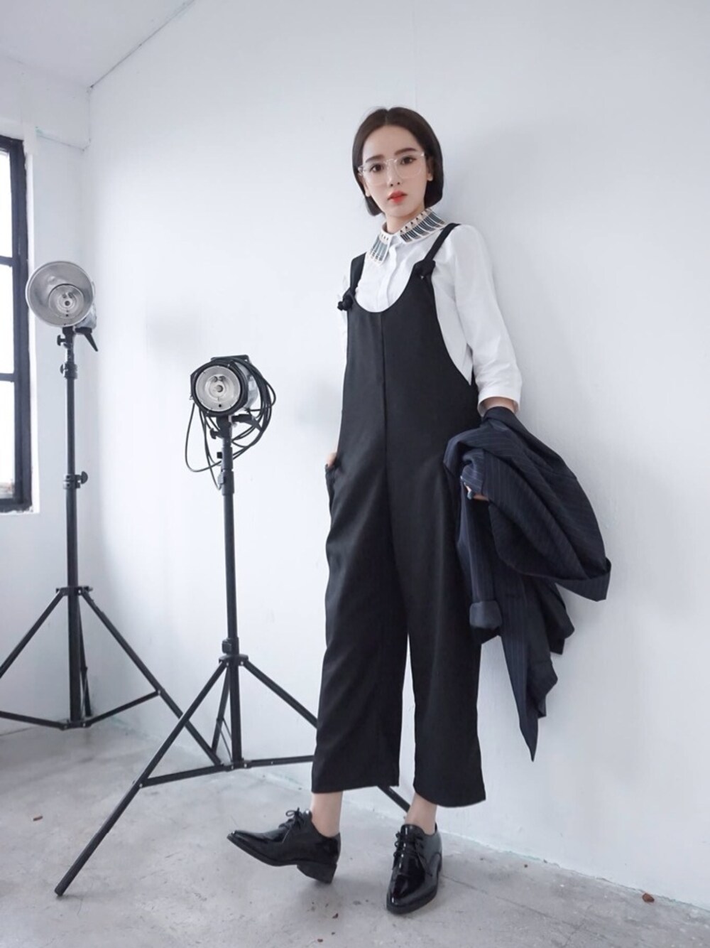 鉛筆襯衫 Little Unicas 吊帶寬褲 AJpeace 直條紋外套 Nai Korea 透明眼鏡 GU 鞋 a'Lady