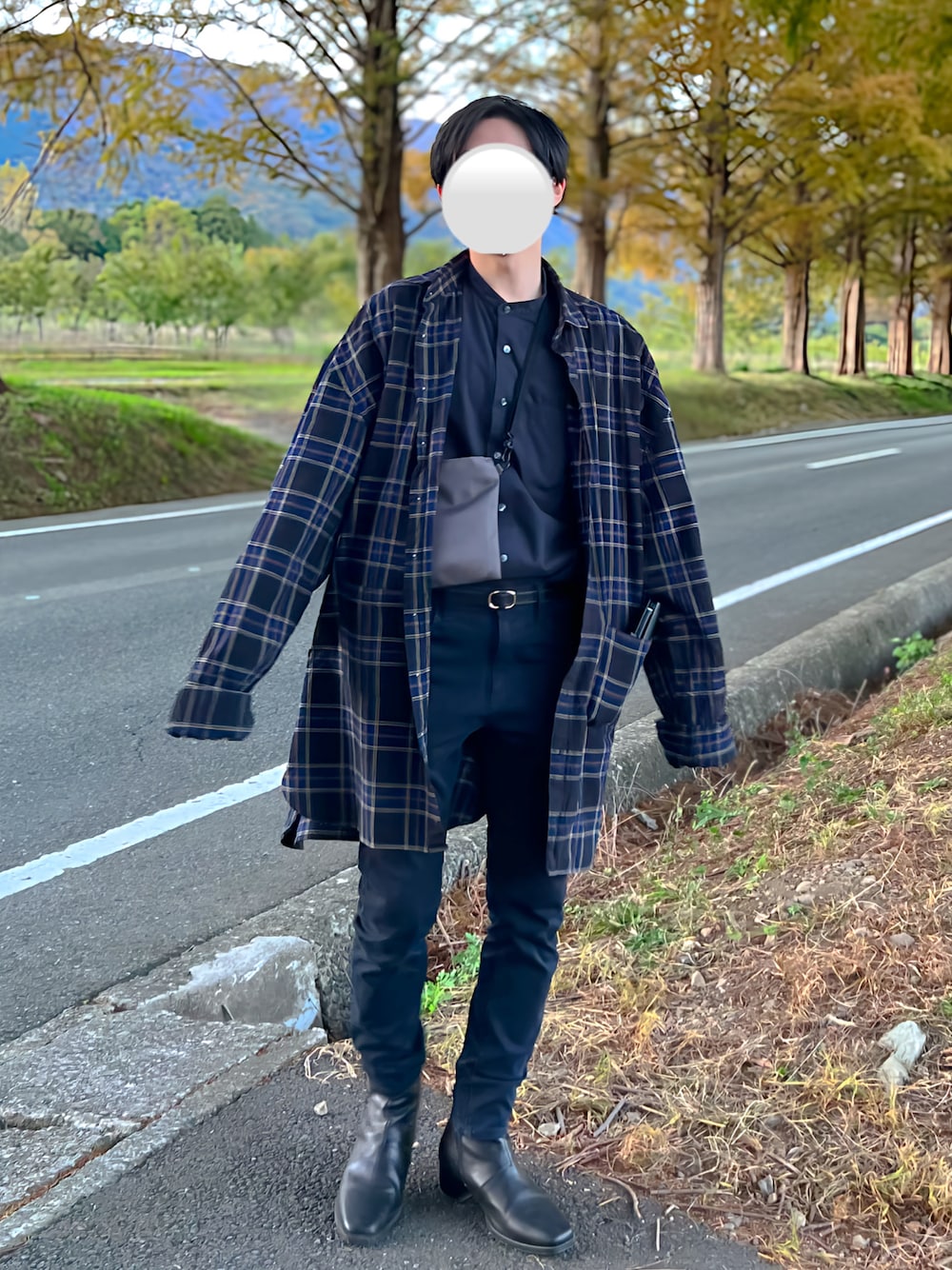 はじめましてkouと申します。 初めての投稿となりますが本日からよろしくお願い致します🙇 ーーーーーーーーーーーーーーーーーーーー 今回のコーデはアウターで着ている チェックのオーバーシャツとスタンドカラーシャツのシャツ×シャツコーデです。 オーバーシャツの生地的に12月下旬までが限界なので、 今の昼間は気温が高く夕方から冷えてくる季節にはオススメです。 オーバーシャツは手を通さず、肩から羽織るだけでもGood!! 基本的にはブラック×グレー(マスク)×チェック柄の3種類でまとめてます。
