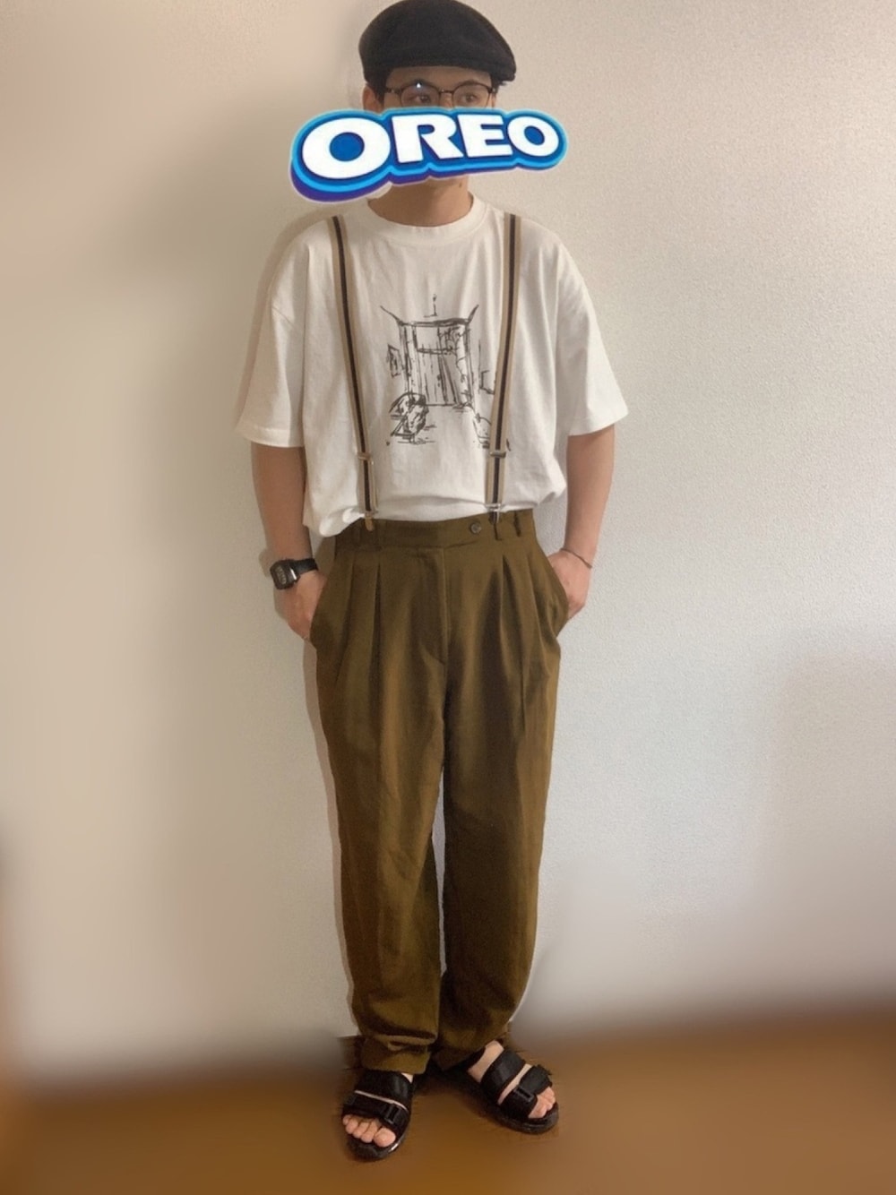 サスペンダーを使った英国少年風コーデ オリーブドラブの色味とサラサラなウール生地が癖になるツータックスラックスが子供っぽさを中和してくれている(気がする)