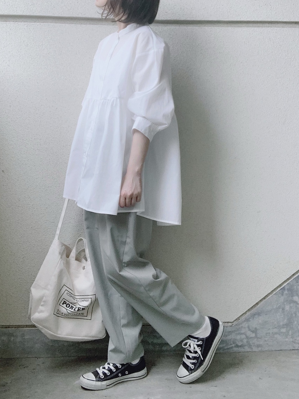 あやたのシャツ/ブラウス「バンドカラーボリューム袖ギャザーフレアシャツ」を使ったコーディネート