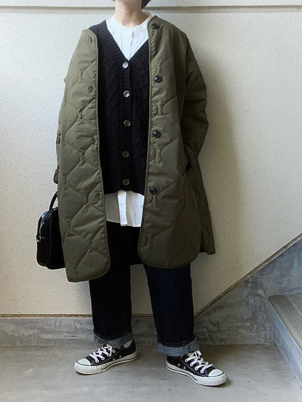 あやたのノーカラーコート「キルトノーカラーBIGコート【ZOZOTOWN限定】」を使ったコーディネート