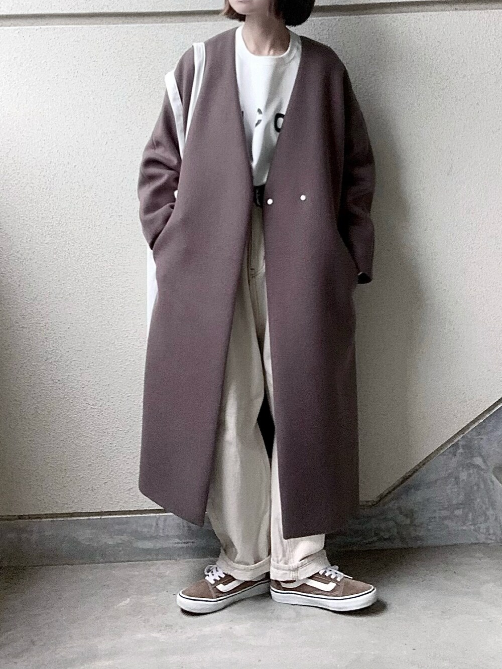 見てくださって、ありがとうございます🙏🏻 茶と白のあやたです👦🏻 低身長向けのコートはサイズちょうどよさげです🙆🏻♂️ 丸顔やけん首元がすっきり見えるノーカラーコート好き。 いつも、ありがとうございます🙏🏻 恐縮です🙇🏻♂️