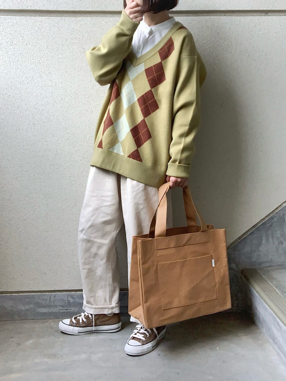 見てくださって、ありがとうございます🙏🏻 アーガイル柄が可愛いVネックニット🙆🏻♂️ ライトグリーンとブラウンの色合い好きです☺︎ Vネックやけん重ね着も楽しめます🙋🏻♂️ MUHET ☞アーガイルVネックニット ☞ タイベックトートバッグ 耐久性のあるタイベック素材のトートバッグ。 素材感から出るレトロな感じが可愛い🙆🏻♂️ うちのコーデはあんまポイントないんやけど(オイ🌝)コンバースの色、トートとアーガイルの色に合わせてみました🍫 いつも、ありがとうございます🙏🏻 恐縮です🙇🏻♂️