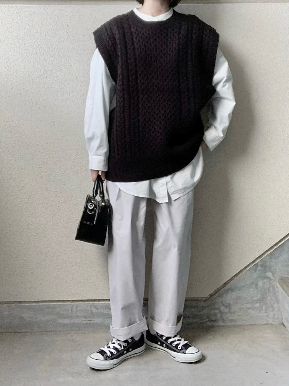 あやたのベスト「アクリルウール ケーブルニットベスト」を使ったコーディネート