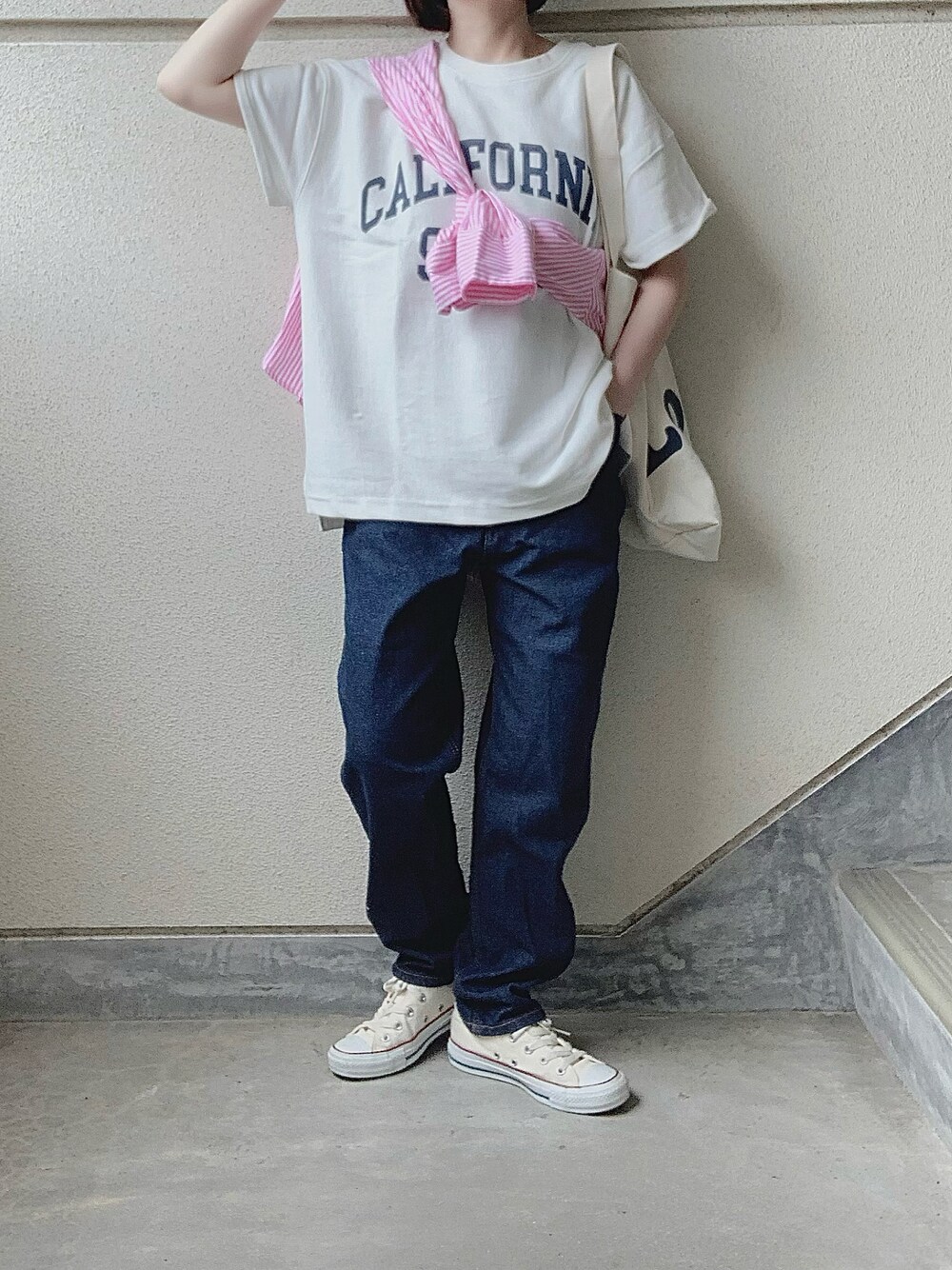 あやたのTシャツ/カットソー「バスク生地 ロゴプリントフレンチスリーブTシャツ 半袖Tシャツ」を使ったコーディネート