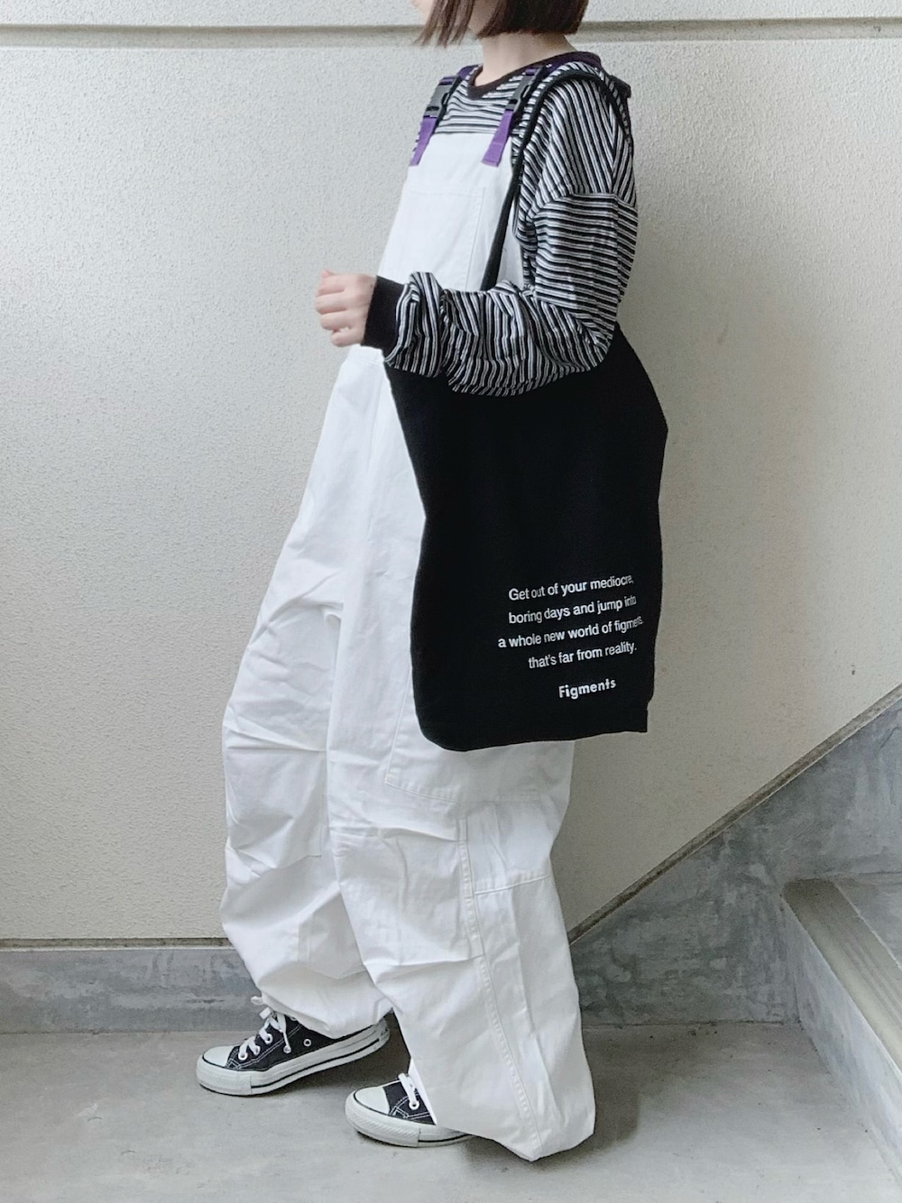 あやたのサロペット/オーバーオール「EDWIN エドウィン WEB限定【ユニセックス】 EDWIN STEPMARK バルーンオーバーオール サロペット ビブ カーゴパンツ」を使ったコーディネート