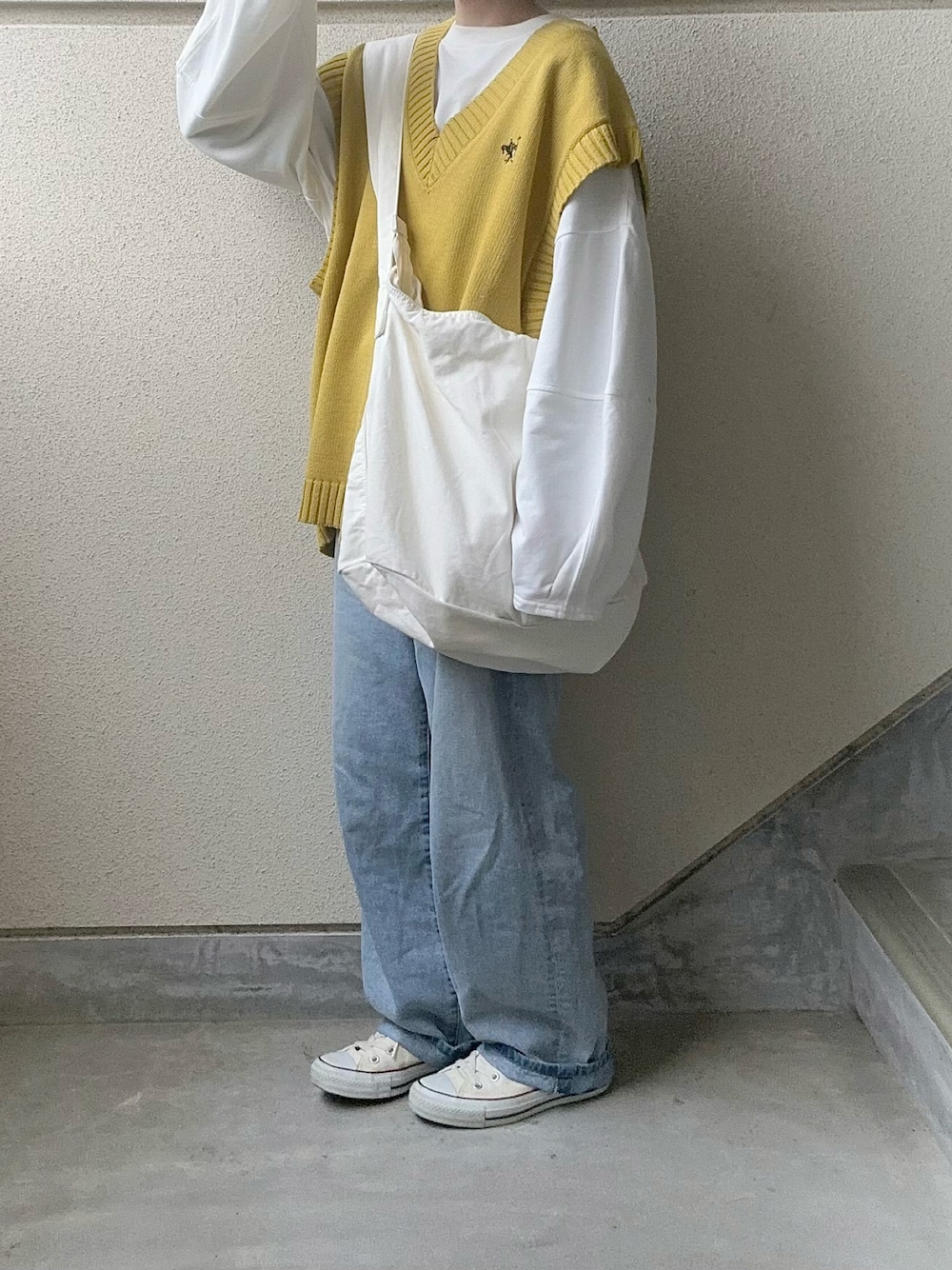 あやたのベスト「《JaVa ジャバコラボ》ワンポイント刺繍カレッジニットベスト」を使ったコーディネート
