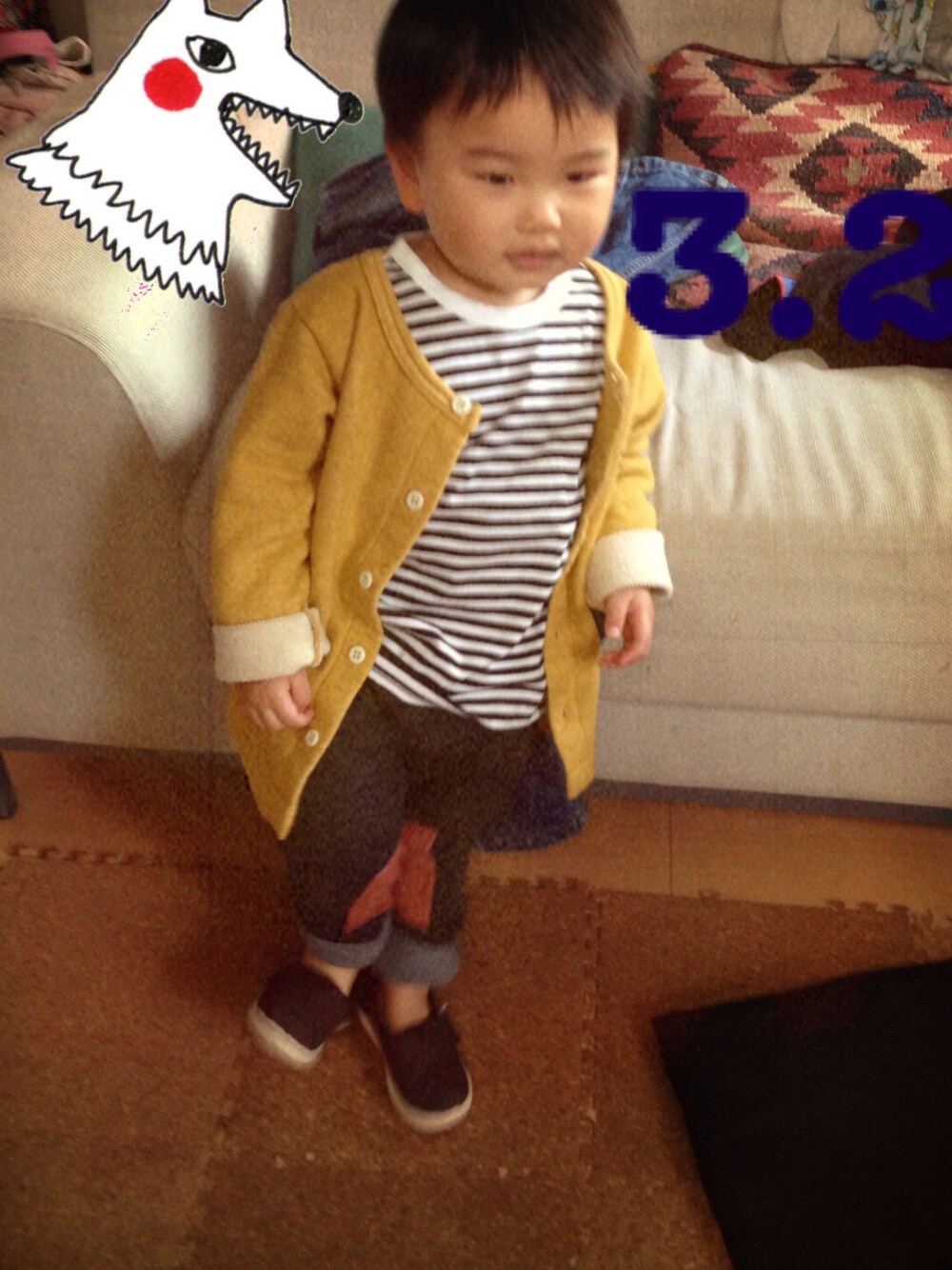 イエロー系のカーディガン/ボレロを着用したキッズの春コーディネートの1枚目の写真