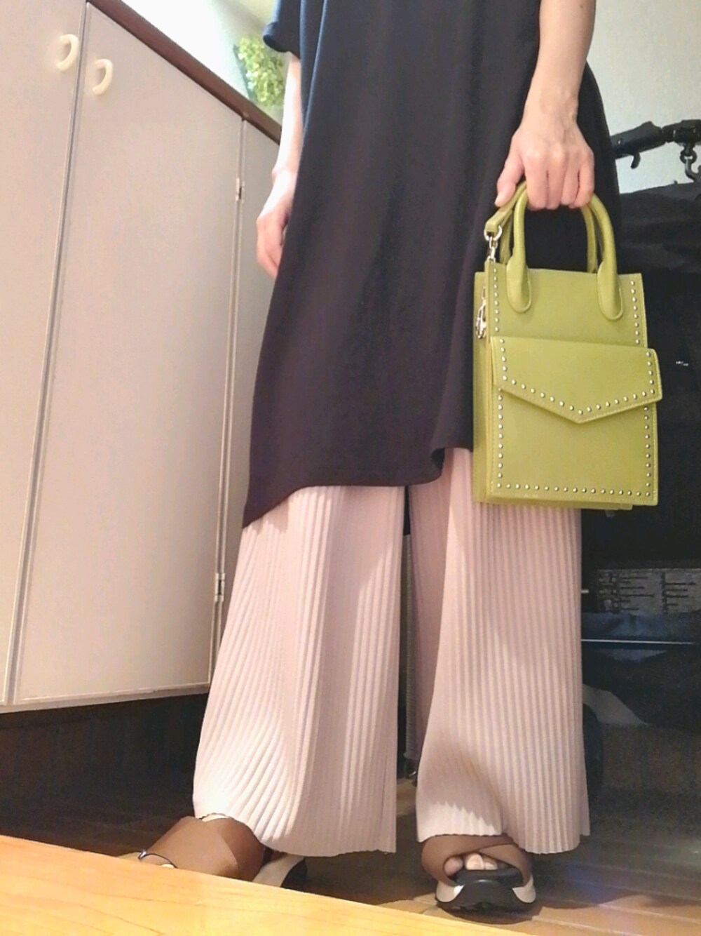 おはようございます☺️🙌✨ 調子にのって、 今日も投稿😁☘️ 先週のコーディネート👕 ワンピースに、プリーツパンツの 組み合わせ😊🌱 真夏は、暑くて出来なかった コーディネートだけど、 涼しくなったので😃🌾 ライムカラーが、好きで bagも選んでしまう😁⭐✨ ローリーズファームの、 パンツも履きやすいです☺️🙌 色違いが欲しかったけど、 我慢🤫💫✨