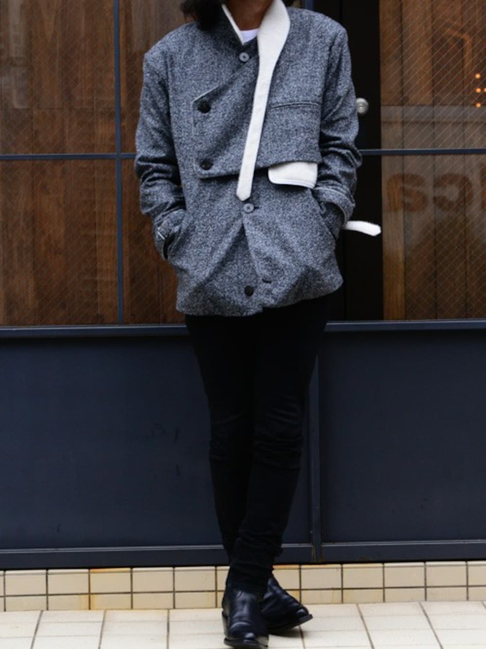 ブラック系のブーツ、グレー系のブルゾンを着用したメンズの冬コーディネートの1枚目の写真