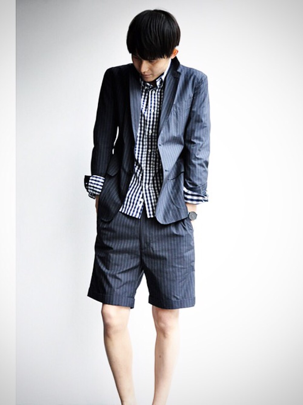 ショーツとのセットアップです! ストライプ×ギンガムチェックの柄on柄ですが、違和感なく合わせられています!