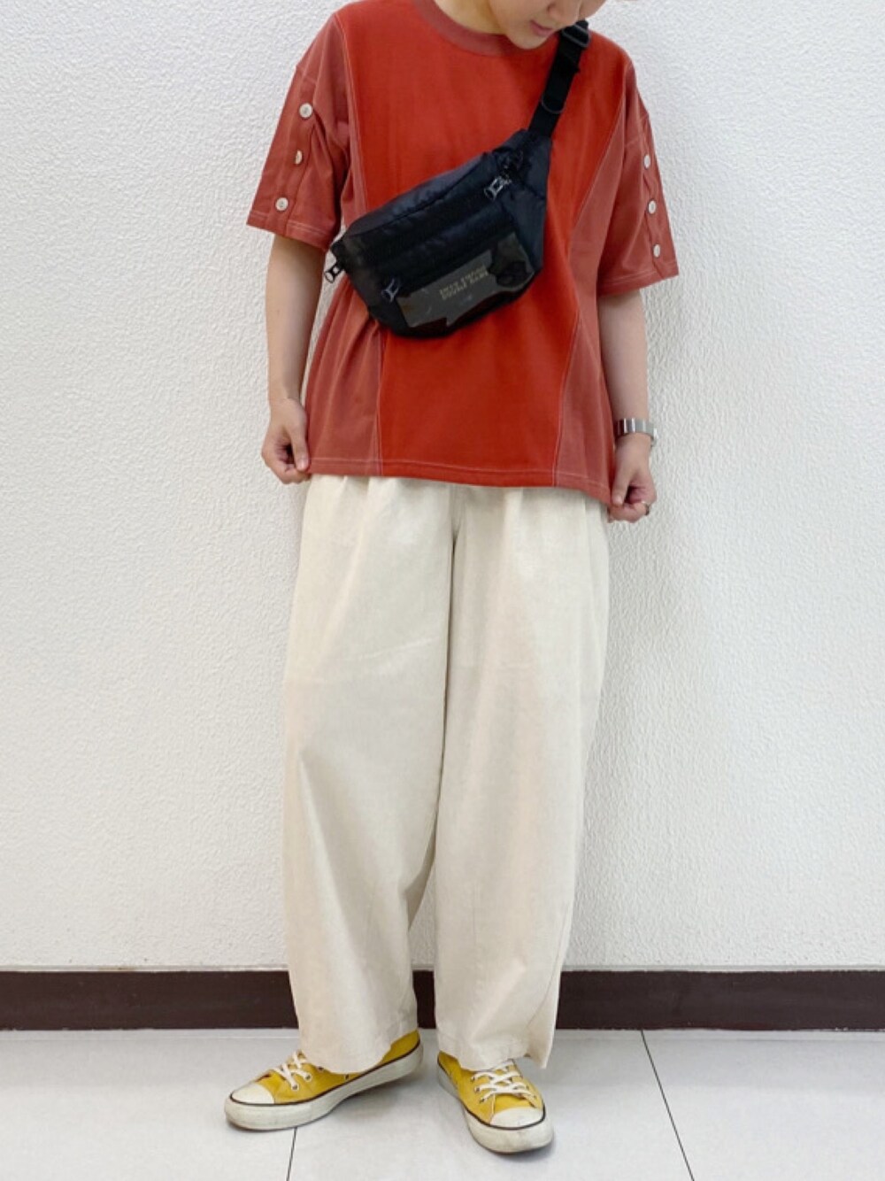 さりげない配色で、袖にはボタンが施してある、シンプルでもこだわりのあるデザインTシャツです! パンツだけでなくスカート合わせもコーデに取り入れやすいです◎ パンツは何回でも履いてしまう大好きな綿麻素材のワイドパンツ! 丸みのあるシルエットのおかげで履き心地バツグンです! [身長165cm]