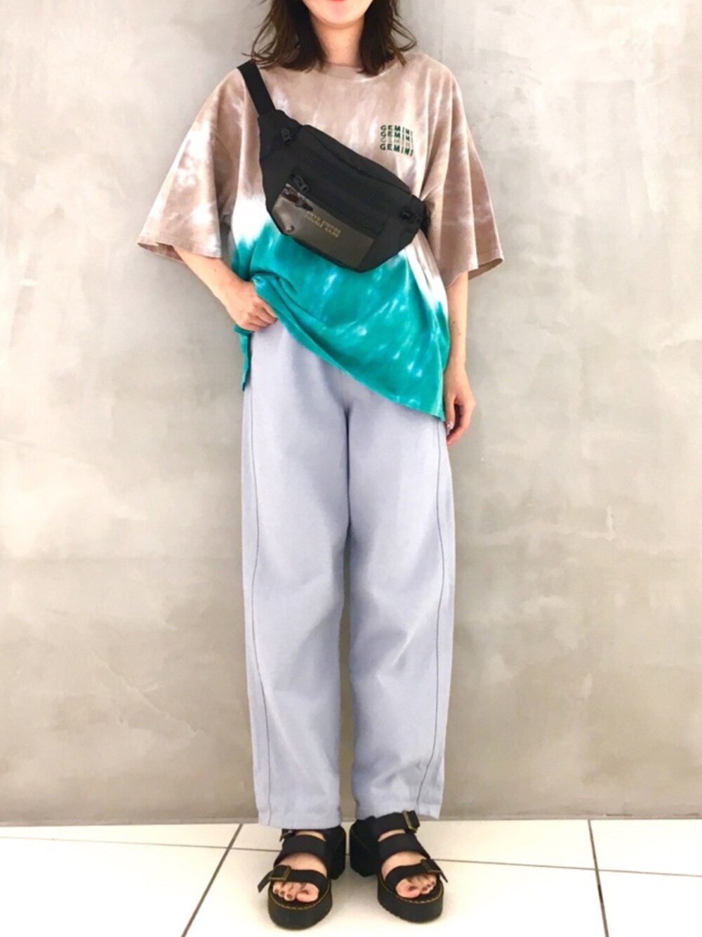 こんにちは!タイダイ染めTシャツが夏に映えますね!珍しい配色になってます◎ロゴ入りでカジュアルに!パンツは裾に向かって細くなっていくシルエット!154cmでもフルレングスでいける丈が嬉しい!ウエストで2段階サイズ調節ができます◎ 身長154cm